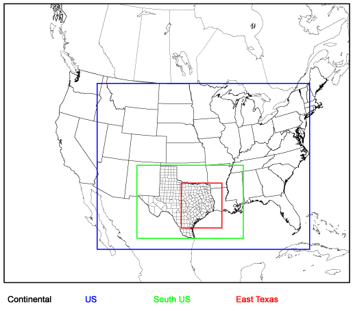 The horizontal modeling domain grid structure consists of a coarse grid continental domain and four nested subdomains: the Continental Domain, U.S. Domain, South U.S. Domain, and East Texas Domain.