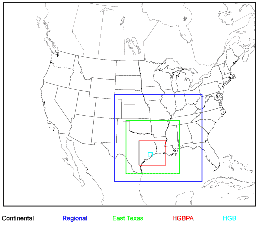 The horizontal modeling domain grid structure consists a coarse grid continental domain and four nested subdomains: Regional Domain, East Texas Domain, Houston/Galveston/Brazoria-Beaumont/Port Arthur (HGBPA) Domain, and optional Houston/Galveston Bay (HG) Domain.