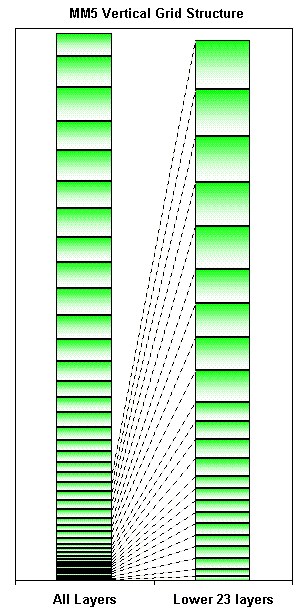 Meteorological model MM5 modeling domain horizontal grid and vertical layer structures for the Houston-Galveston-Brazoria Ozone SIP Mid-Course Review.