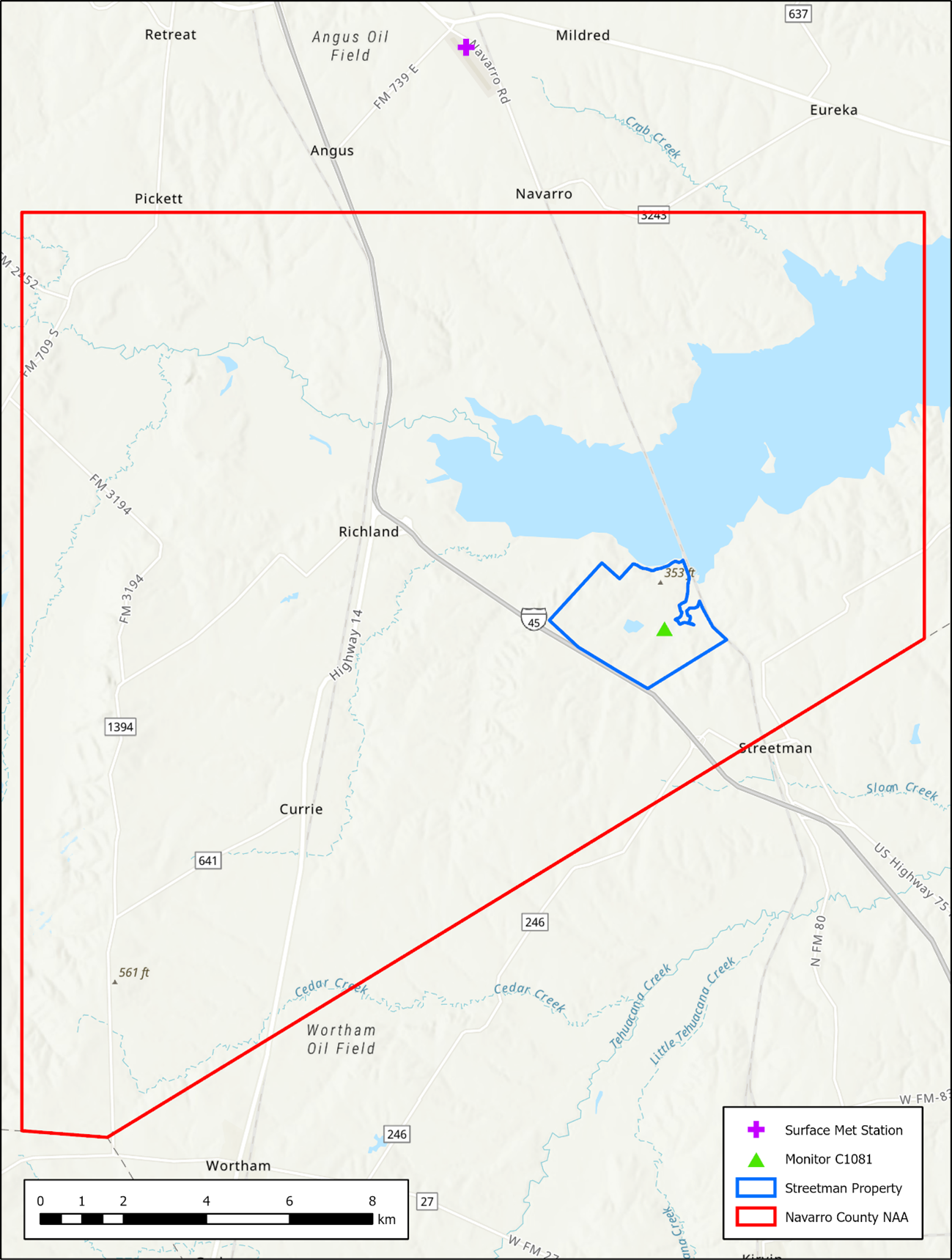 The Streetman Plant owned by Arcosa LWS, LLC has one SO2 emissions source within the Navarro County 2010 SO2 NAAQS nonattainment area, outlined in blue on the map. The Richland Southeast 1220 Road monitor, or Continuous Ambient Monitoring Station 1081 (C1081), is required under the Data Requirements Rule and was sited (green triangle on the map) in 2016 to monitor SO2 concentrations near the facility. The National Weather Service monitor (purple plus sign on the map), located at the Corsicana Municipal Airport, provided the surface meteorological data input for this modeling.