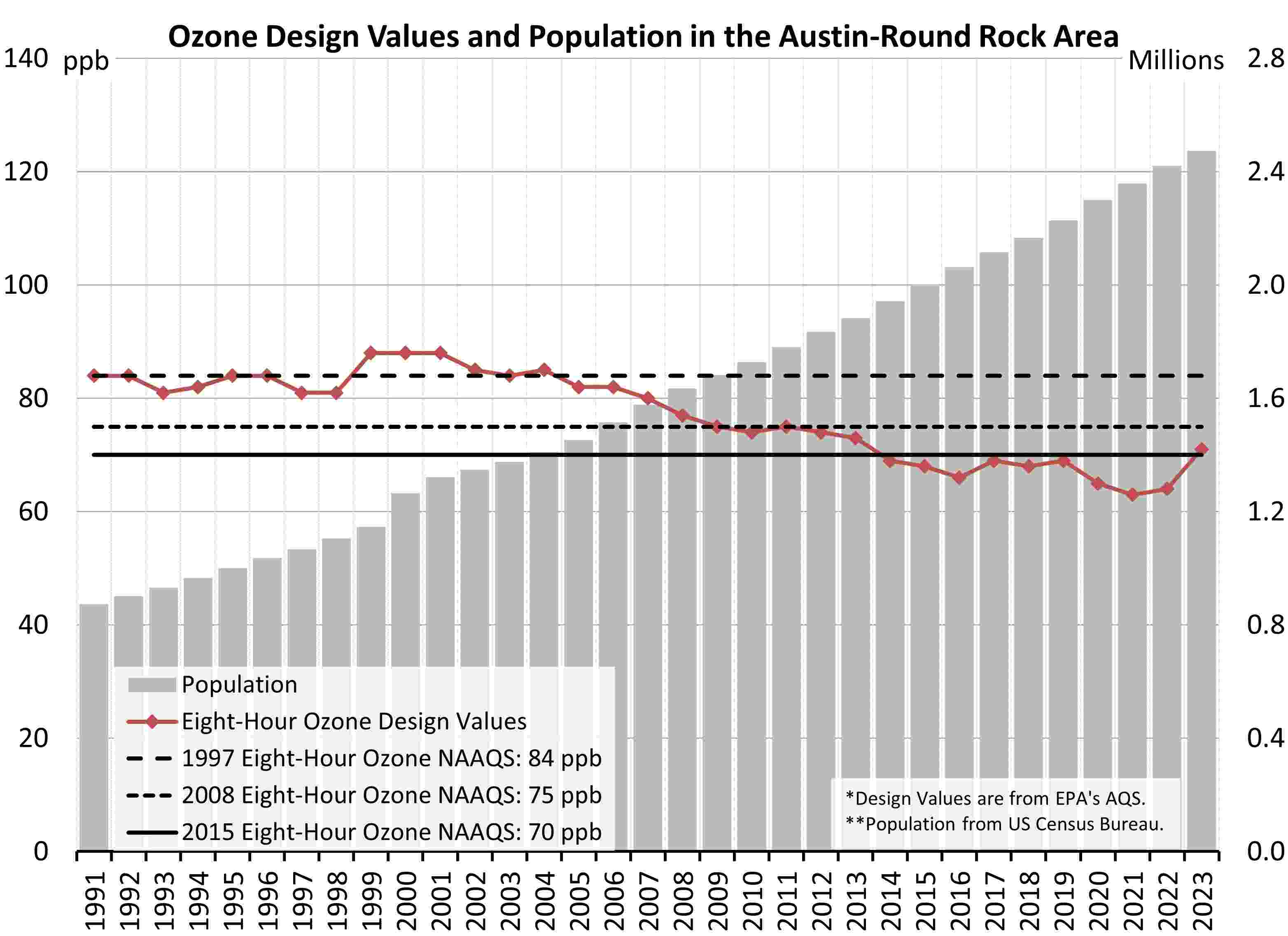 - From 1991 through 2023, the Austin-Round Rock (ARR) population increased by 183%, while the eight-hour ozone design values decreased by 15%.