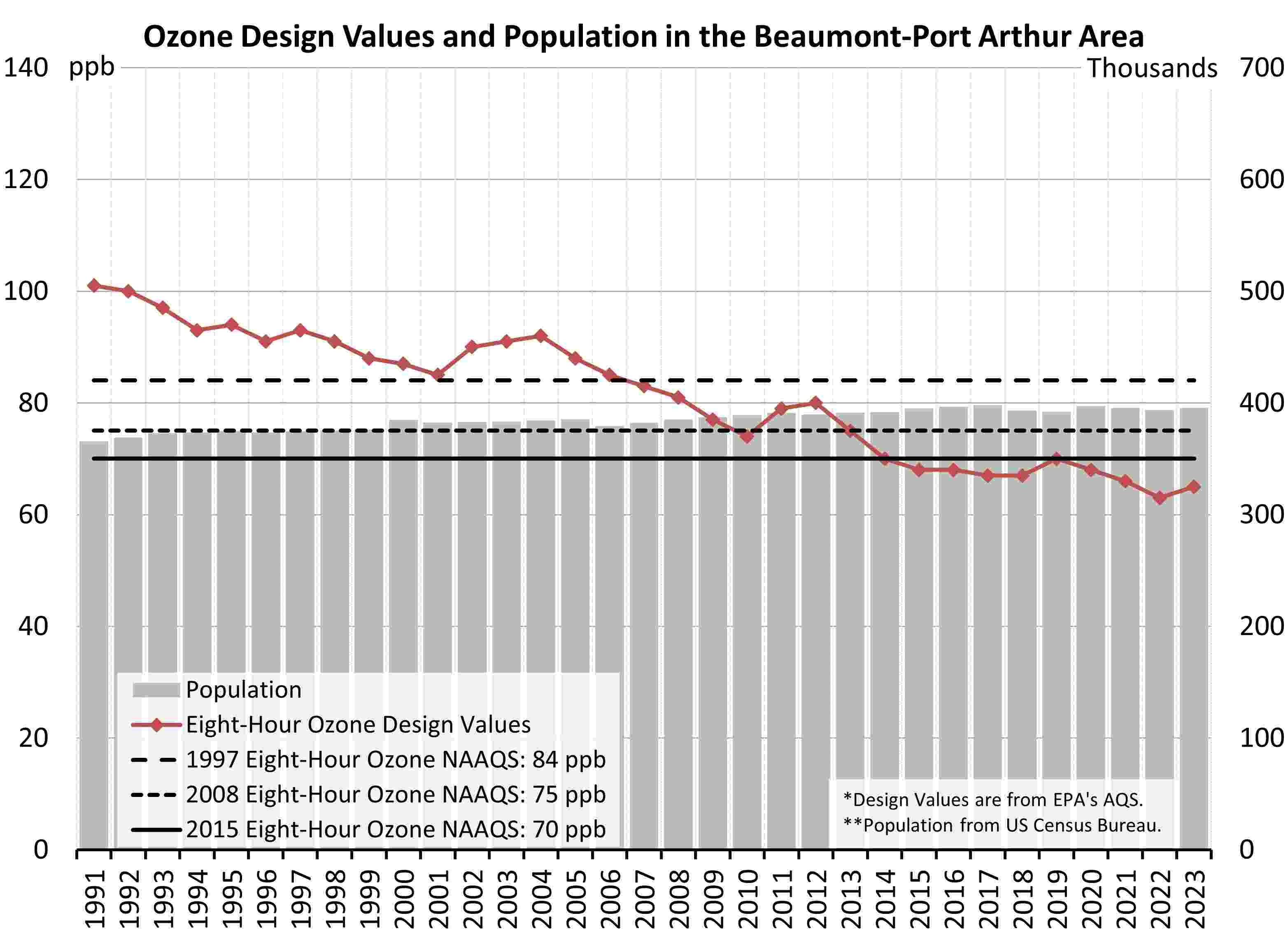 - From 1991 through 2023, the Beaumont Port-Arthur (BPA) population increased by 8%, while the eight-hour ozone design values decreased by 36%.