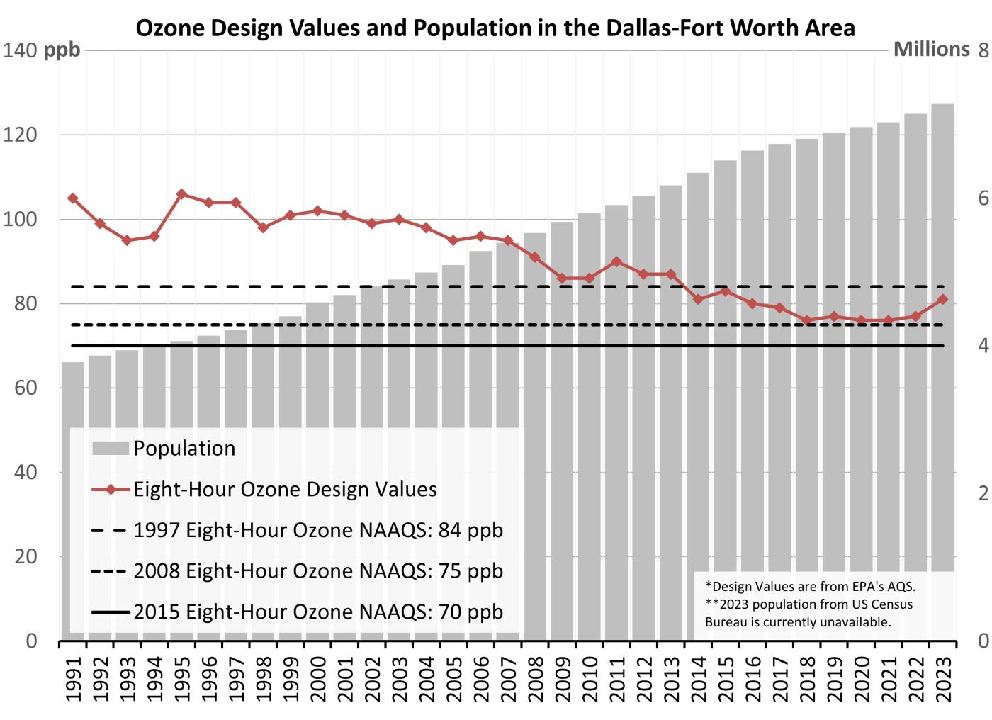 - From 1991 through 2023, the Dallas Fort-Worth (DFW) population increased by 98%, while the eight-hour ozone design values decreased by 23%.