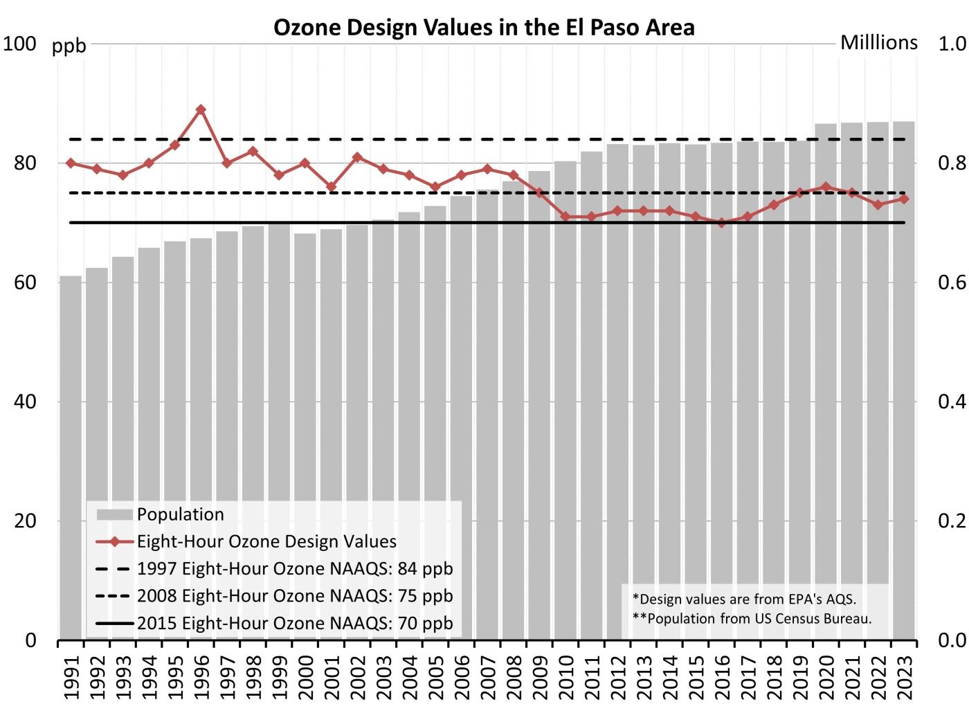 - From 1991 through 2023, the El Paso (ELP) population increased by 42%, while the eight-hour ozone design values decreased by 8%.