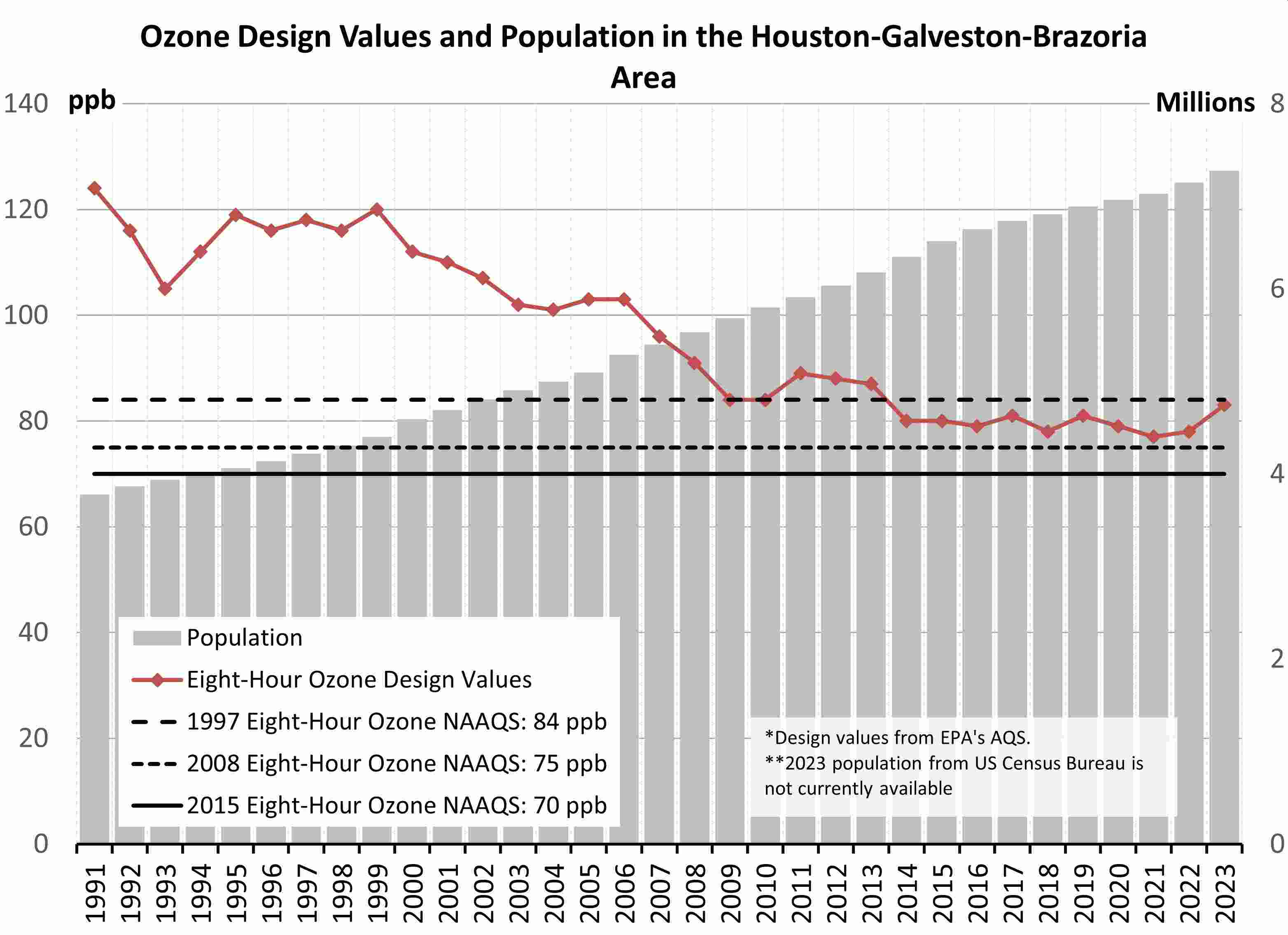 - From 1991 through 2023, the Houston-Galveston-Brazoria (HGB) population increased by 93%, while the eight-hour ozone design values decreased by 23%.