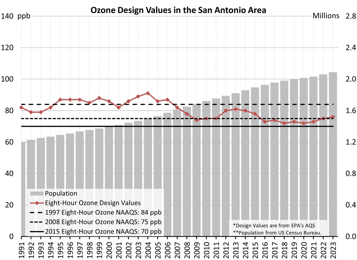 - From 1991 through 2023, the San Antonio (SAN) population increased by 87%, while the eight-hour ozone design values decreased by 7%.
