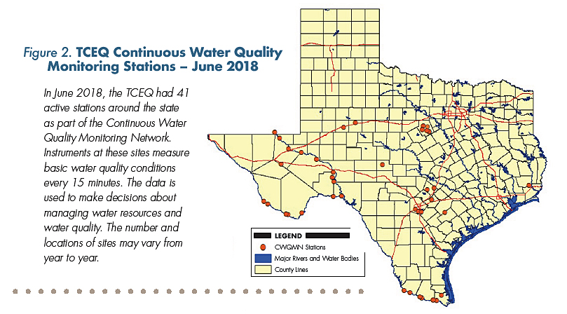 The TCEQ has developed—and continues to refine—a network of continuous water quality monitoring sites on priority water bodies. The agency maintains 40 to 50 sites in its Continuous Water Quality Monitoring Network (CWQMN). At these sites, instruments measure basic water quality conditions every 15 minutes.