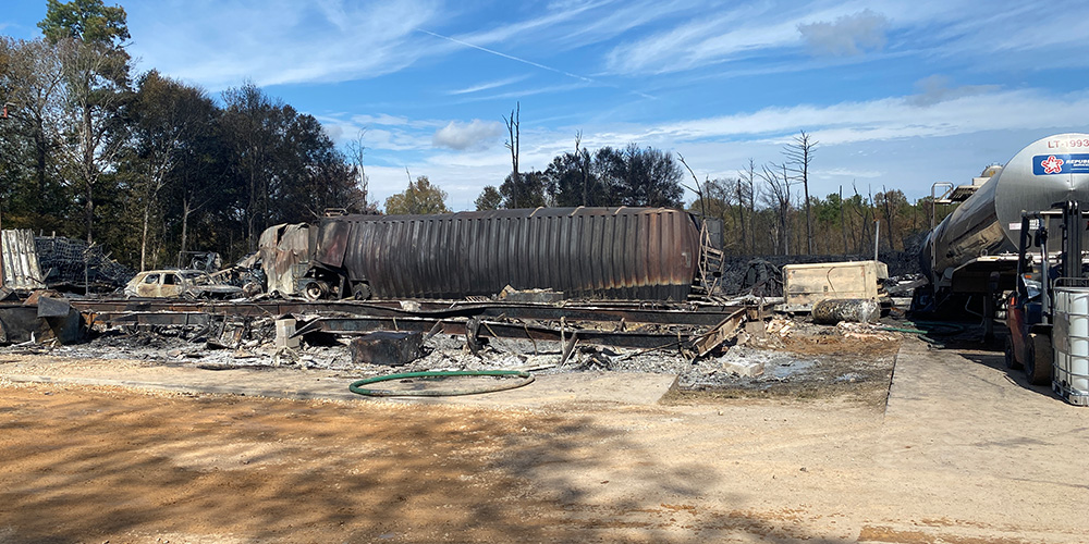 TCEQ responded to a fire and explosion at the Sound Resource Solutions chemical blending facility in Shepherd on Nov. 8, 2023. The incident started when an electrical fire on a forklift ignited a spilled chemical. The fire spread rapidly, engulfed the entire facility, and consumed the majority of the 6.62 million pounds of chemicals onsite. Approximately 30 residences and two schools were evacuated, and a shelter-in-place order was issued for the area within a five-mile radius of the facility. More than 20 fire departments responded to the incident.