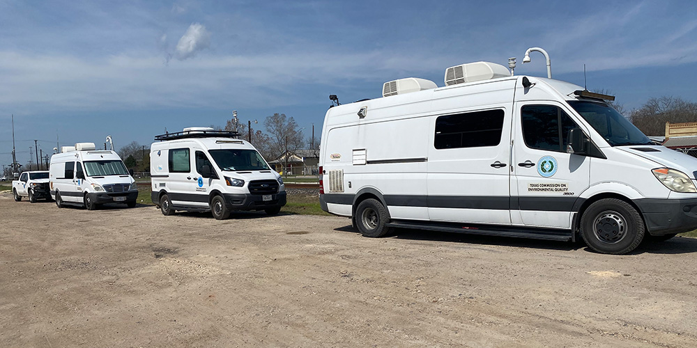In the past several years, TCEQ has built up a fleet of eight vans and specialized vehicles equipped with instruments able to collect air monitoring data while the vehicles are in motion. These mobile monitors are used for field investigations, special air quality projects, environmental emergencies, and natural disaster recovery efforts. The instruments provide accurate, real-time measurements of concentrations of select chemicals in ambient air, typically in 1- to 30-second increments.