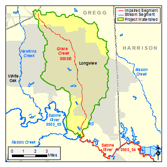 The project watershed lies in the Sabine River Basin in and around Longview, Texas, covering about 116 square miles. Grace Creek flows through the city of Longview and into the Sabine River. There is a popular hike and bike trail and nature area along a stretch of Grace Creek. To varying degrees, stormwater runoff from agricultural, industrial, and urban areas affects water quality in the creek.