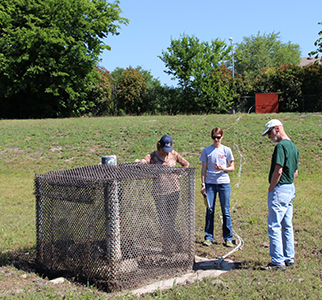 The outflow structure for the basin is connected to an automated sampler in orange box (background). Faith Hambleton of TCEQ Nonpoint Source Program, and Amy Gilpin and project contractor Michael Barrett, both from the University of Texas Center for Research in Water Resources, discuss the structure.