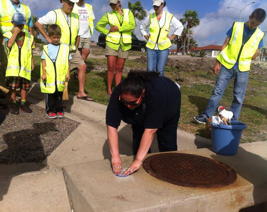 Demonstrating Storm Drain MarkingShowing the team how and where to place the marker. https://www.tceq.texas.gov/waterquality/tmdl/nav/97-corpus/97-stormdrainpics/97-demonstrating/viewhttps://www.tceq.texas.gov/waterquality/tmdl/nav/97-corpus/97-stormdrainpics/97-demonstrating/@@images/image-1200-6ef72c7a352b0d2ae8af0e4bc7d2c99c.jpeg?v=None