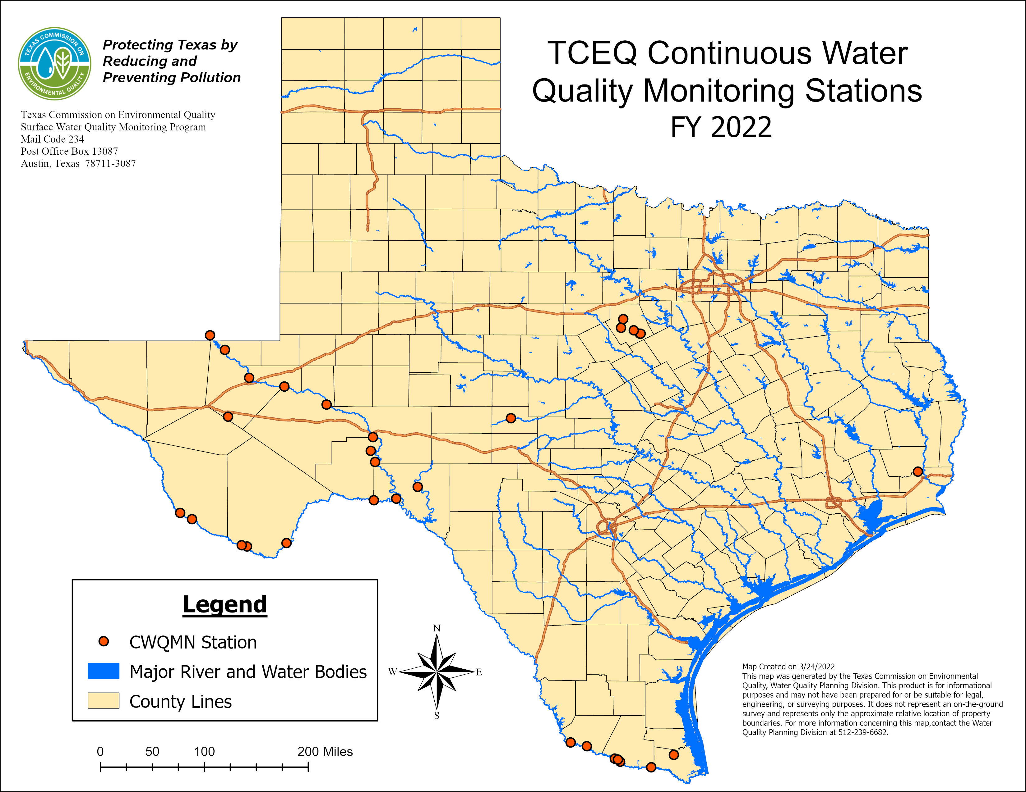 TCEQ continuously monitors water quality parameters at stations in selected watersheds throughout Texas.